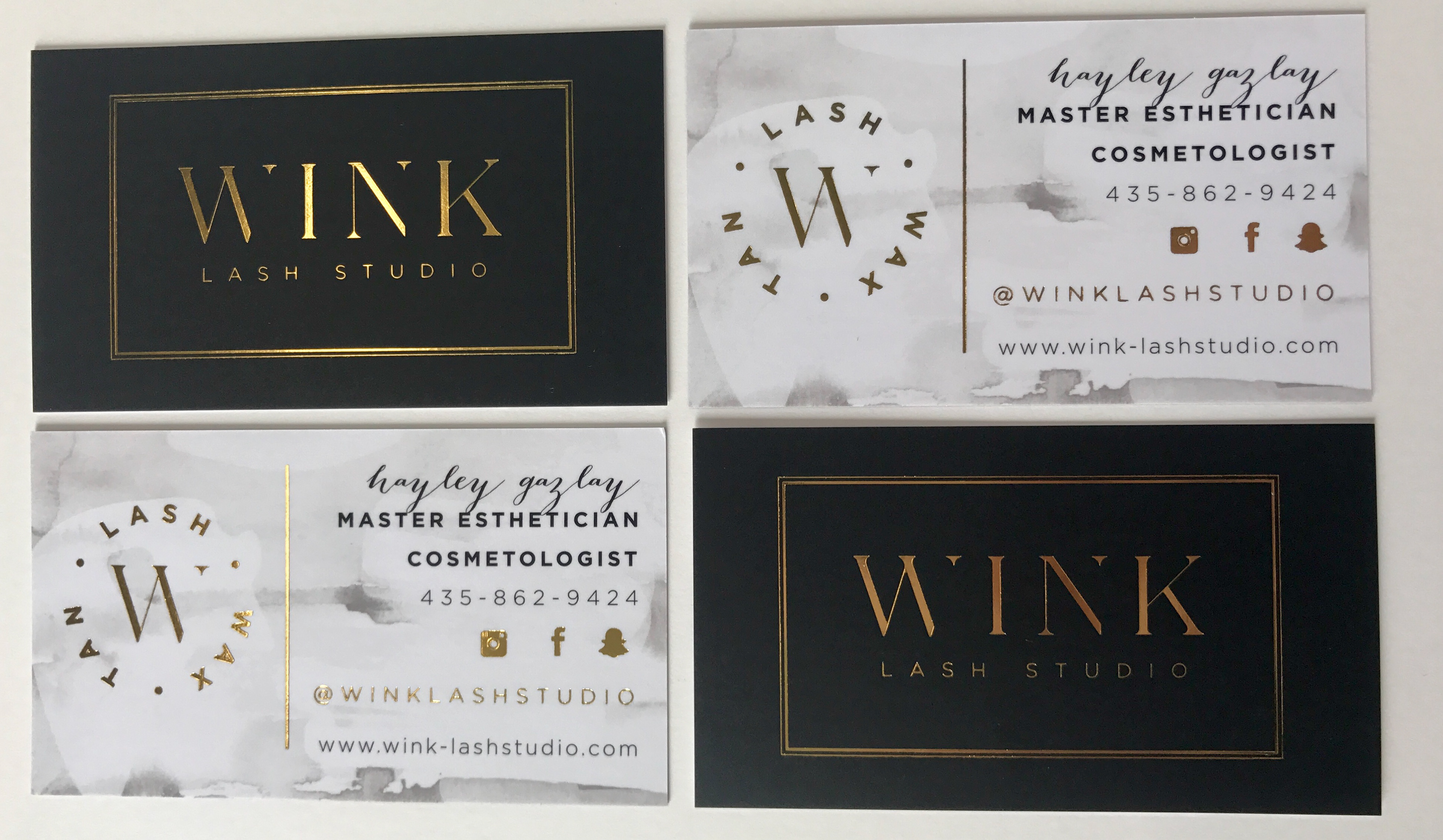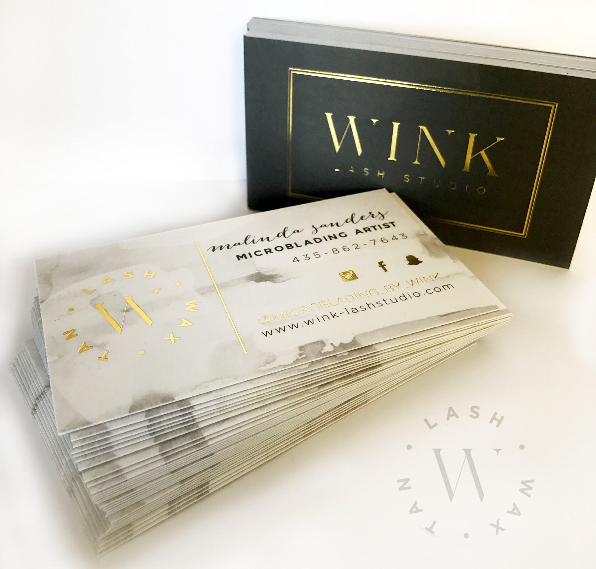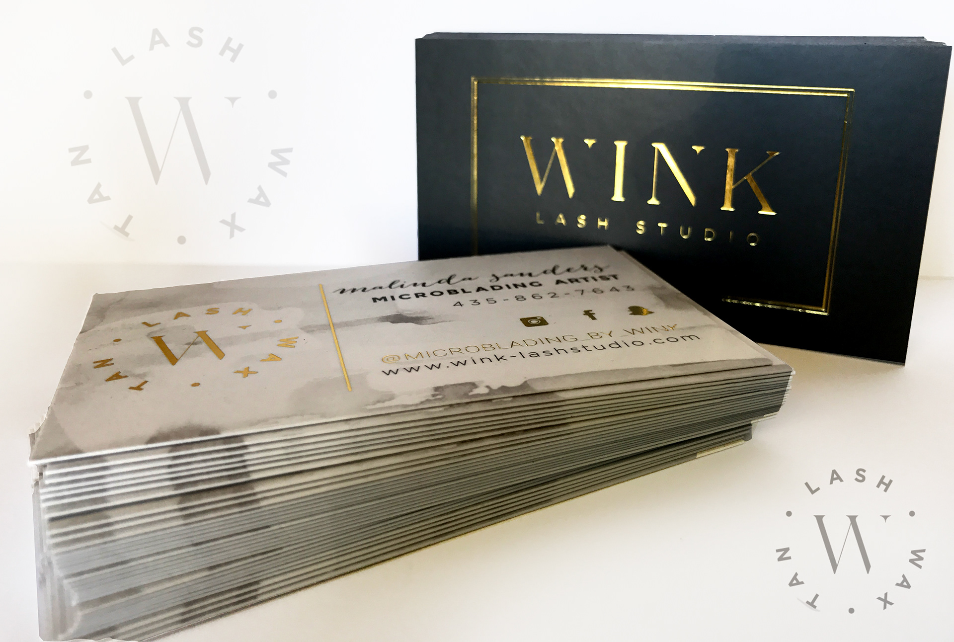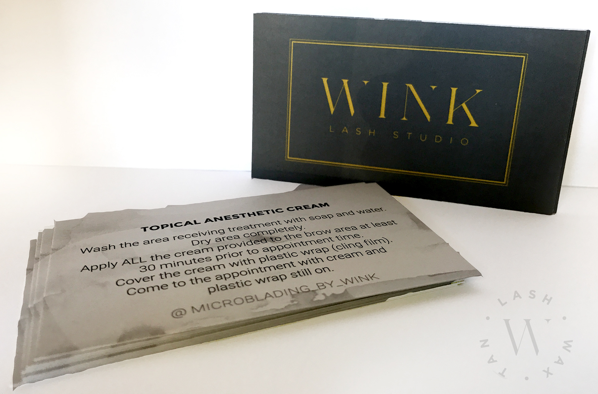 Wink Microblading Artist Contact Cards, Care Cards, and Topical Cream Instruction Cards. Matte Cards with Gold Foil accent on Contact Cards. Matte finish on Care Cards and Topical Cream Instruction Cards