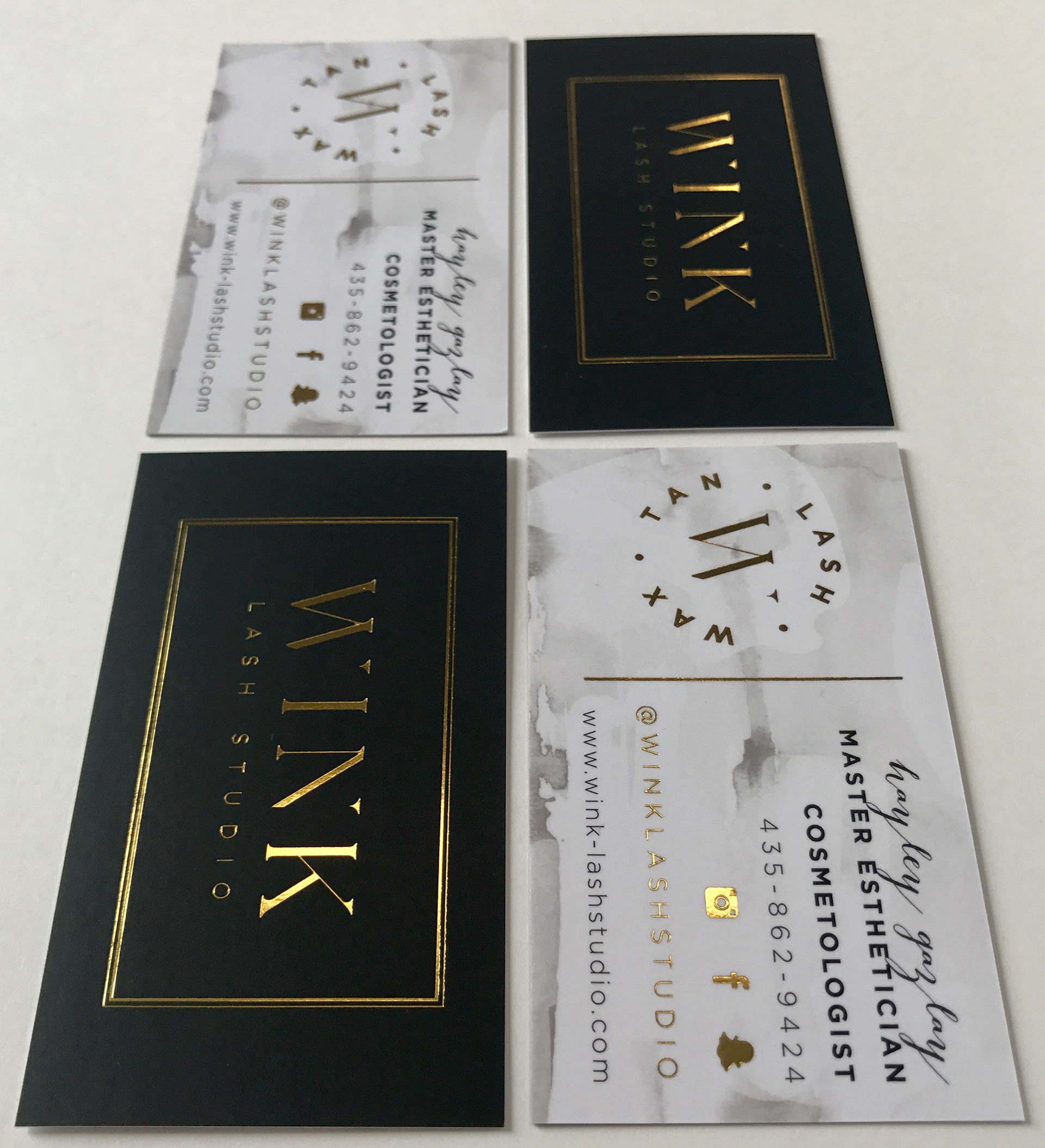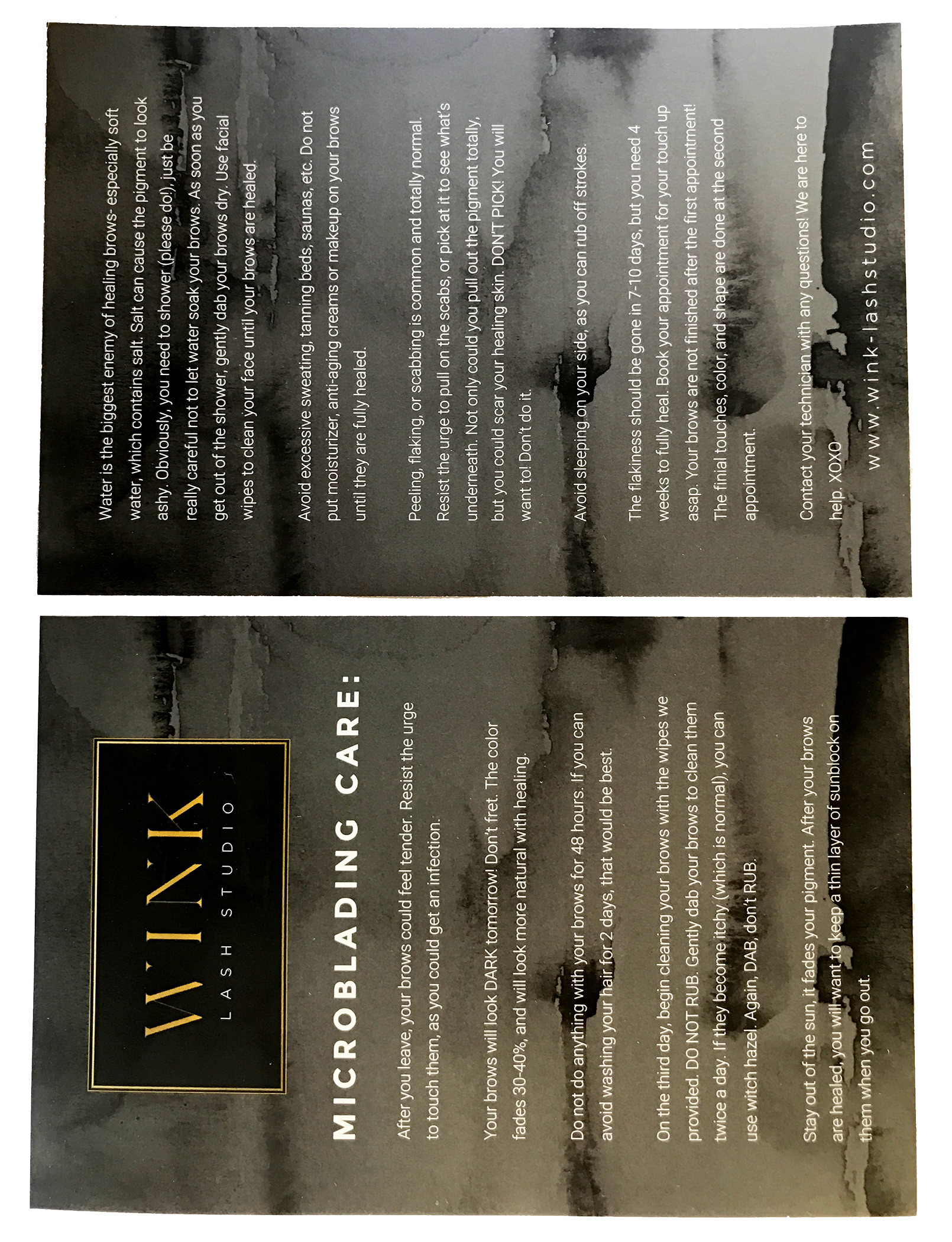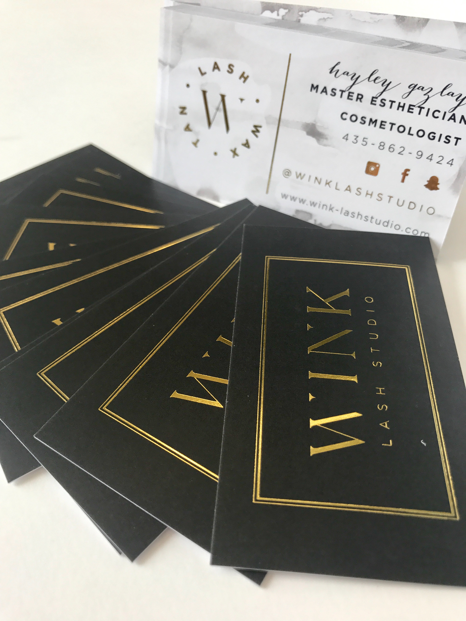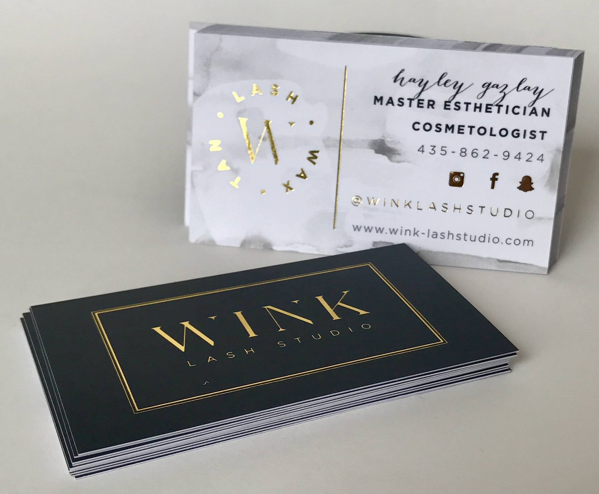 Wink Microblading Artist Contact Cards, Care Cards, and Topical Cream Instruction Cards. Matte Cards with Gold Foil accent on Contact Cards. Matte finish on Care Cards and Topical Cream Instruction Cards